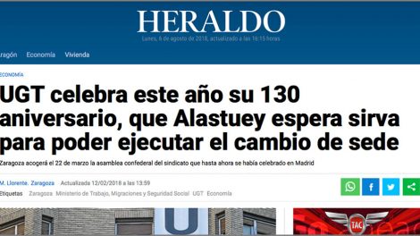 12 de febrero de 2018. Heraldo. Este 2018 va a ser un año de efemérides para UGT Aragón. Así lo ha destacado este lunes Daniel Alastuey que ha...