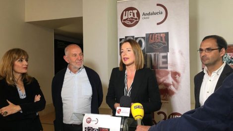 Ana Carrera, diputada provincial y Victor Mora, alcalde de Sanlúcar de Barrameda, acompañados por Antonio Pavón, Secretario General de UGT-Cádiz y...