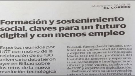 9 de septiembre de 2018. El Correo. Expertos reunidos por UGT con motivo de la celebración de su 130 aniversario debatieron ayer en Bilbao sobre los...