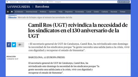 12 de agosto de 2018. La Vanguardia. El secretario general de UGT de Catalunya, Camil Ros, ha reivindicado este domingo la necesidad de los...