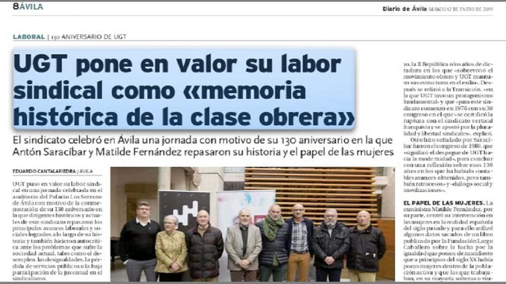 12 de enero de 2019. Diario de Ávila UGT puso en valor su labor sindical en una jornada celebrada en el auditorio del Palacio Los Serranos de Ávila con motivo de su 130 aniversario en la que dirigentes históricos y actuales de este sindicato repasaron los principales avances laborales y...