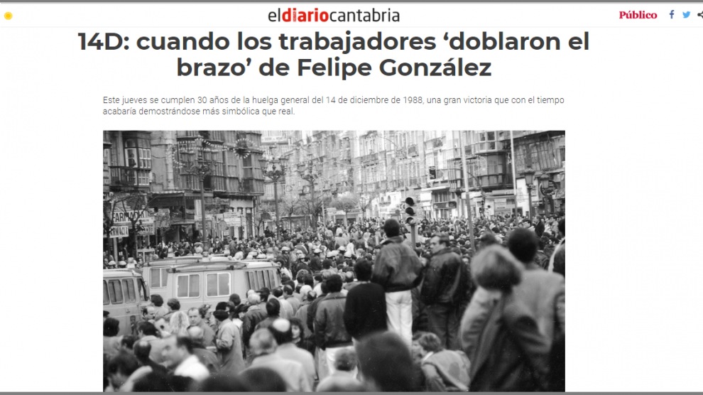 13 de diciembre de 2018. eldiariocantabria.es La del 14 de diciembre de 1988, contra el Plan de Empleo Juvenil previsto por el Gobierno español presidido por Felipe González (PSOE), fue la primera huelga general de 24 horas convocada por los dos sindicatos mayoritarios, Comisiones Obreras...
