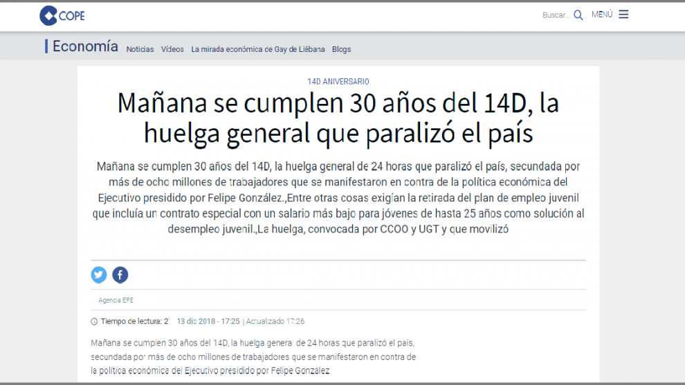 13 de diciembre de 2018. COPE Mañana se cumplen 30 años del 14D, la huelga general de 24 horas que paralizó el país, secundada por más de ocho millones de trabajadores que se manifestaron en contra de la política económica del Ejecutivo presidido por Felipe González. Entre otras cosas...