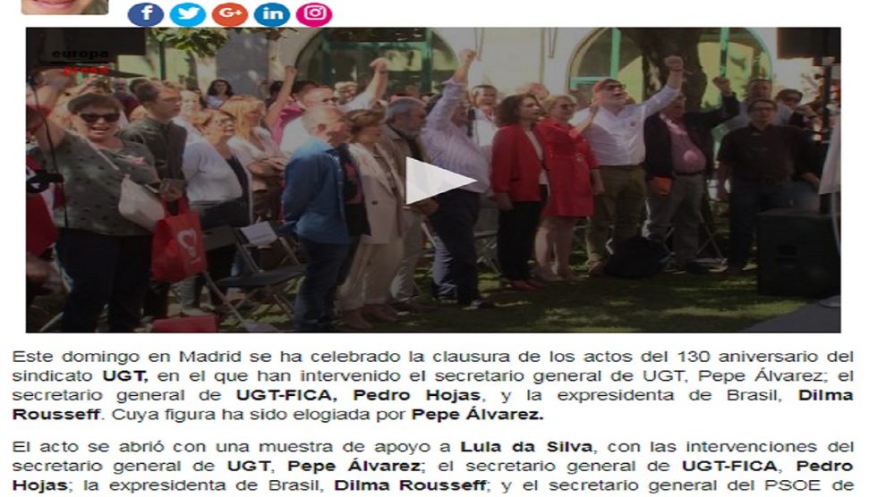 Madrid Diario. Octubre 2019 Se ha celebrado la clausura de los actos del 130 aniversario del sindicato UGT, en el que han intervenido el secretario general de UGT, Pepe Álvarez; el secretario general de UGT-FICA, Pedro Hojas, y la expresidenta de Brasil, Dilma Rousseff. Cuya figura ha...