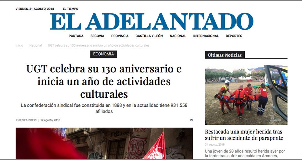 12 de agosto de 2018. El Adelantado. La Unión General de Trabajadores (UGT) celebró ayer 130 años de historia desde su fundación con un acto conmemorativo en Barcelona con el que da paso a un ciclo de actividades que se prolongará hasta septiembre de 2019 y que incluirá exposiciones...