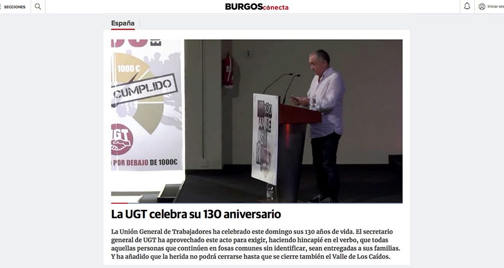 12 de agosto de 2018. Burgos Conecta. La Unión General de Trabajadores ha celebrado este domingo sus 130 años de vida. El secretario general de UGT ha aprovechado este acto para exigir, haciendo hincapié en el verbo, que todas aquellas personas que continúen en fosas comunes sin...