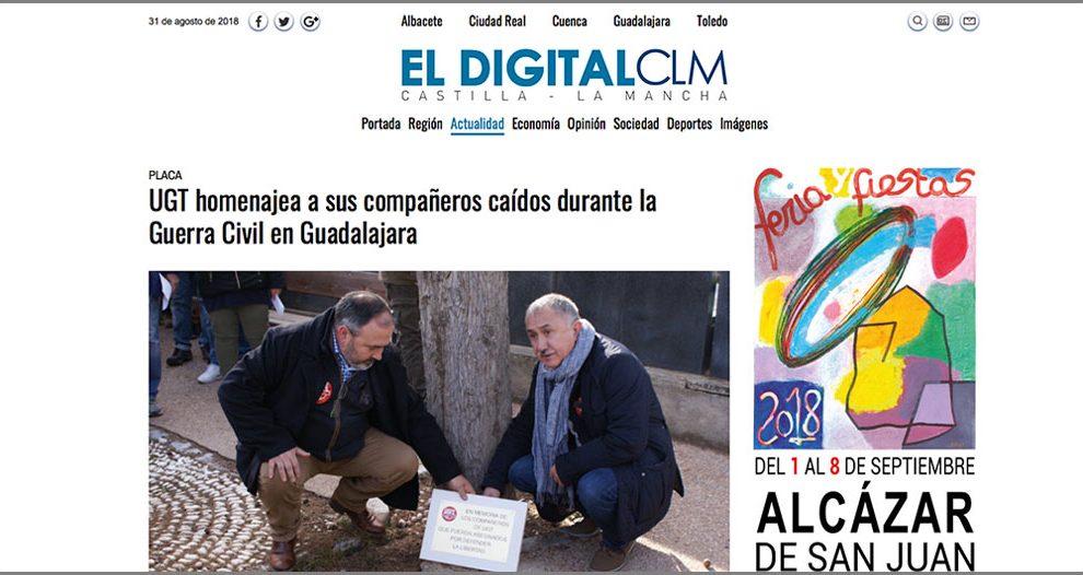 23 de enero de 2018. El digital Castilla – La Mancha. El secretario general de UGT, Pepe Álvarez, y el secretario regional, Carlos Pedrosa, han participado en un acto organizado por el sindicato para colocar una placa en homenaje a los 365 afiliados fusilados en la Guerra Civil en...