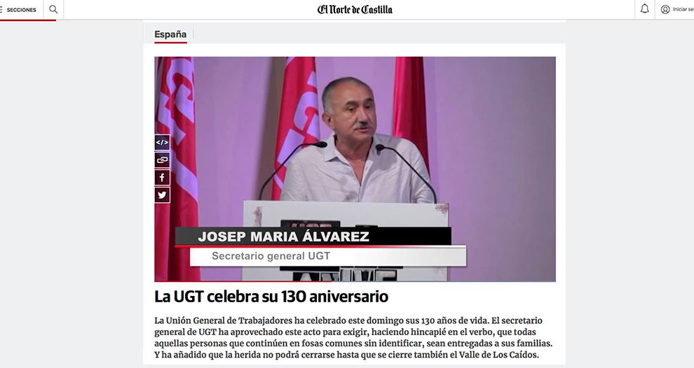 12 de agosto de 2018. El Norte de Castilla. La Unión General de Trabajadores ha celebrado este domingo sus 130 años de vida. El secretario general de UGT ha aprovechado este acto para exigir, haciendo hincapié en el verbo, que todas aquellas personas que continúen en fosas comunes sin...