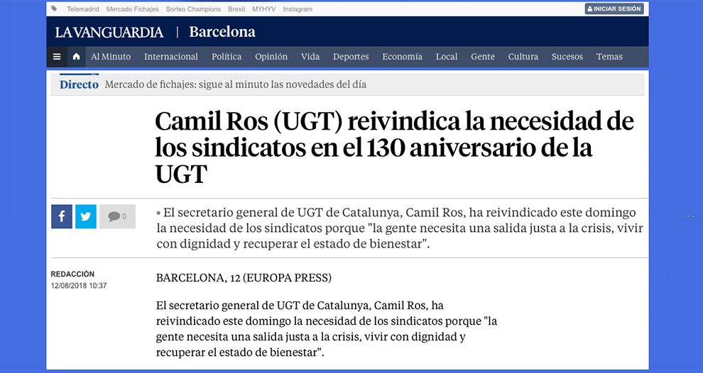 12 de agosto de 2018. La Vanguardia. El secretario general de UGT de Catalunya, Camil Ros, ha reivindicado este domingo la necesidad de los sindicatos porque “la gente necesita una salida justa a la crisis, vivir con dignidad y recuperar el estado de bienestar”. En...