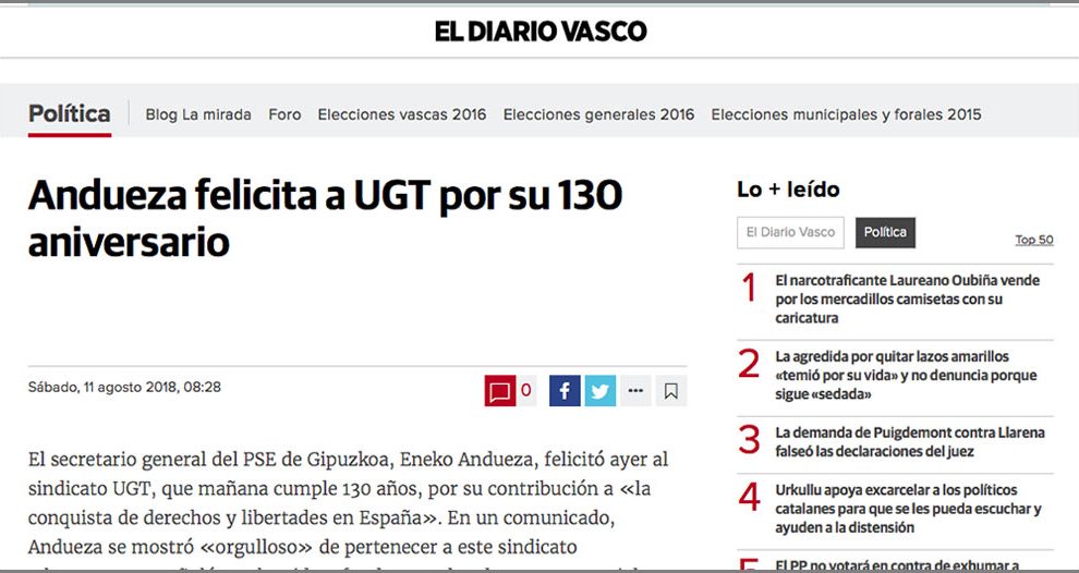 11 de agosto 2018. Diario Vasco. El secretario general del PSE de Gipuzkoa, Eneko Andueza, felicitó ayer al sindicato UGT, que mañana cumple 130 años, por su contribución a «la conquista de derechos y libertades en España». En un comunicado, Andueza se mostró «orgulloso» de pertenecer a...