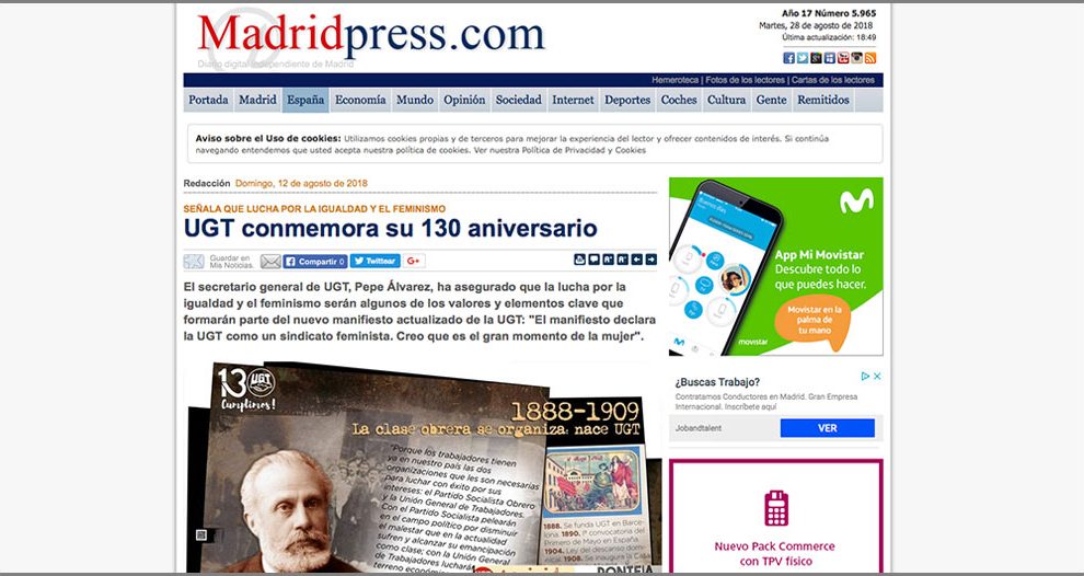 12 de agosto de 2018. Madrid Press. El secretario general de UGT, Pepe Álvarez, ha asegurado que la lucha por la igualdad y el feminismo serán algunos de los valores y elementos clave que formarán parte del nuevo manifiesto actualizado de la UGT: “El manifiesto declara la UGT como...