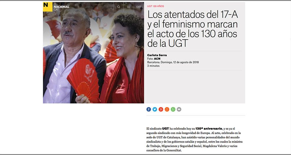 12 de agosto de 2018. El Nacional. El sindicato UGT ha celebrado hoy su 130º aniversario, y es ya el segundo sindicado con más longevidad de Europa. Al acto, celebrado en la sede de UGT de Catalunya, han asistido varias personalidades del mundo sindicalista y de los gobiernos catalán y...