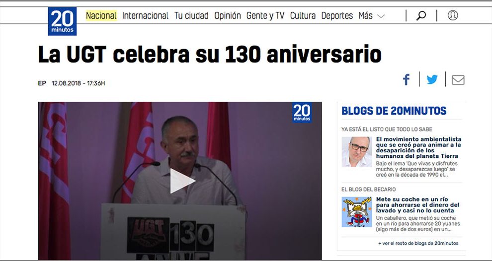 12 de agosto de 2018. 20 Minutos. La Unión General de Trabajadores ha celebrado este domingo sus 130 años de vida. El secretario general de UGT ha aprovechado este acto para exigir, haciendo hincapié en el verbo, que todas aquellas personas que continúen en fosas comunes sin identificar...