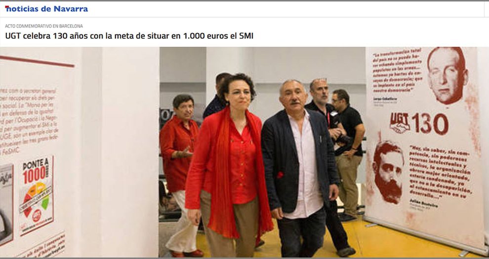 13 de agosto de 2018. Noticias de Navarra. UGT celebró ayer 130 años de historia desde su fundación con un acto conmemorativo en Barcelona con el que da paso a un ciclo de actividades que se prolongará hasta septiembre de 2019 y que incluirá exposiciones itinerantes, ciclos de...