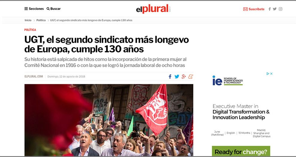 11 de agosto de 2018. El Plural. UGT cumple este domingo 130 años desde su fundación, una trayectoria que le coloca como el segundo sindicato más longevo de Europa y que su secretario general, Pepe Álvarez, resume en una frase, “Detrás de cada derecho y libertad conquistado desde...