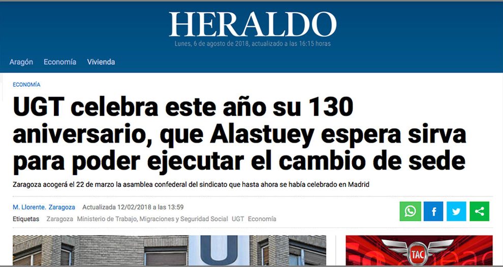 12 de febrero de 2018. Heraldo. Este 2018 va a ser un año de efemérides para UGT Aragón. Así lo ha destacado este lunes Daniel Alastuey que ha recordado la constitución del sindicato en Barcelona el 12 de agosto de 1888. Como parte de ese aniversario, ha adelantado que Zaragoza acogerá el...
