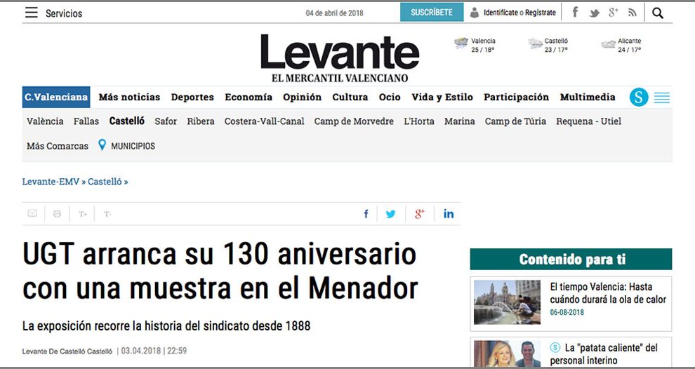 3 de abril de 2018. Levante, el mercantil valenciano. UGT Comarques del Nord presentó en la mañana de ayer la Exposición Itinerante «UN MÓN SENSE CADENES, UGT en la 2ª República(1931-1939)». La muestra está enmarcada dentro de los actos para conmemorar los 130 años de historia de la UGT...
