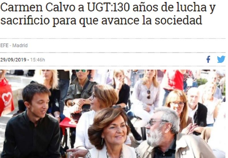 El Diario. Septiembre de 2019 La vicepresidenta del Gobierno en funciones, Carmen Calvo, ha agradecido a la Unión General de Trabajadores (UGT) y a sus 130 años de historia por su “lucha y sacrificio” por defender los derechos de los trabajadores y por el avance hacia una...
