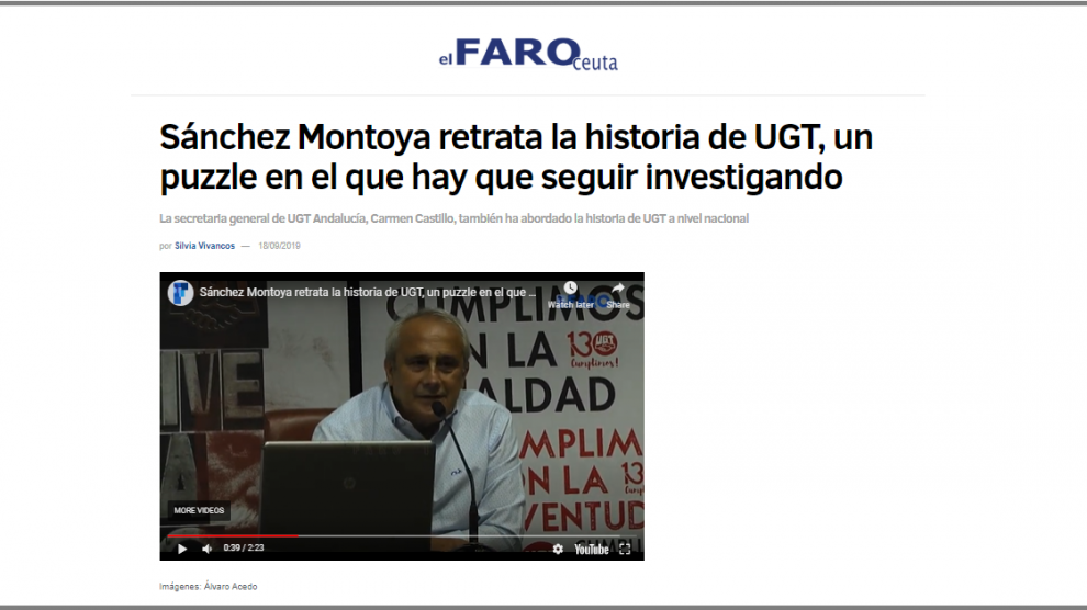18 de septiembre. El Faro Ceuta Los actos por el 130 aniversario de UGT se han cerrado con dos conferencias en las que se ha hecho un recorrido por la historia del sindicato, tanto a nivel nacional como local. El historiador Francisco Sánchez Montoya inició la ronda de ponencias con un...