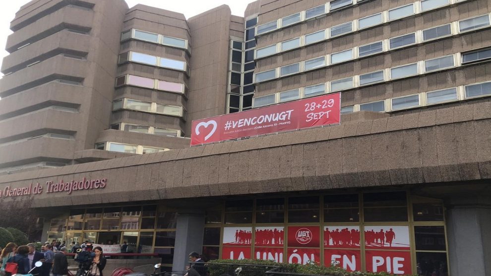 El sindicato despliega en su sede de Avenida de América de Madrid un cartel de grandes dimensiones con el hashtag #VENCONUGT La Unión General de Trabajadores pone fin a la conmemoración de su 130 Aniversario con un gran acto final que se celebrará en la Escuela Julián Besteiro (C/ Azcona...