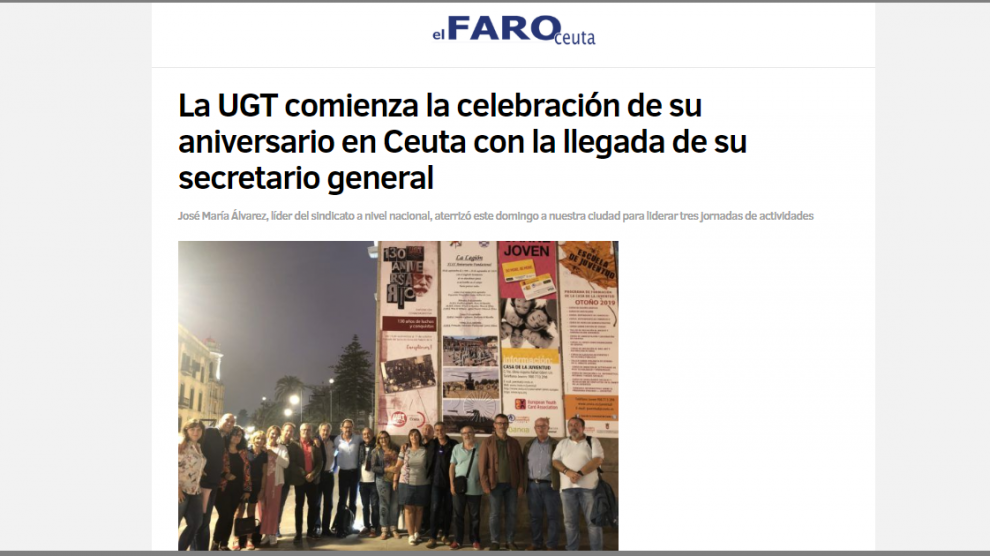 15 de septiembre. El Faro Ceuta La Unión General de Trabajadores (UGT) está de aniversario, celebrando 130 años de lucha sindical, y es por ello que una importante comitiva del sindicato ha llegado este domingo a Ceuta para festejar esta efeméride, con José María Álvarez, secretario...