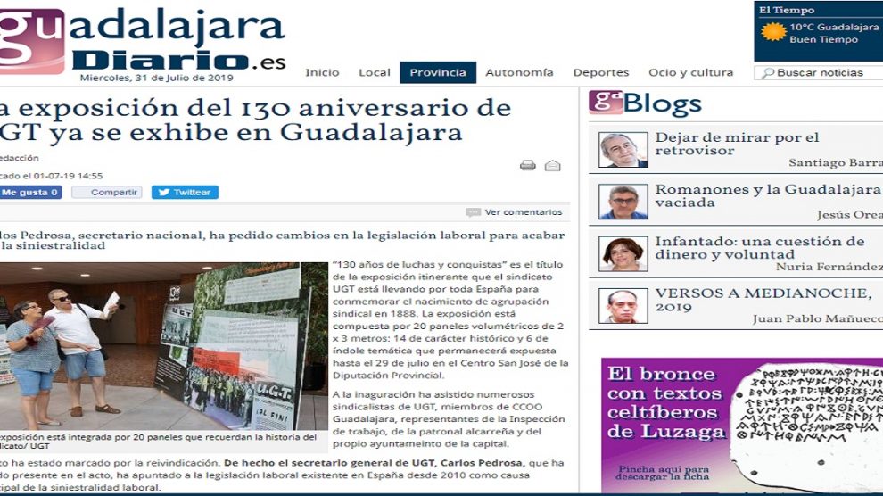 Julio de 2019. GuadalajaraDiario “130 años de luchas y conquistas” es el título de la exposición itinerante que el sindicato UGT está llevando por toda España para conmemorar el nacimiento de agrupación sindical en 1888. La exposición está compuesta por 20 paneles volumétricos de 2...