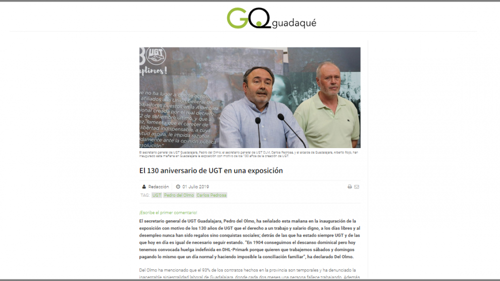 Julio de 2019. Guadaqué El secretario general de UGT Guadalajara, Pedro del Olmo, ha señalado esta mañana en la inauguración de la exposición con motivo de los 130 años de UGT que el derecho a un trabajo y salario digno, a los días libres y al desempleo nunca han sido regalos sino...