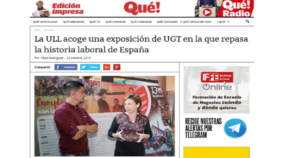 Qué! – Octubre de 2019 La Facultad de Ciencias de Sociales y de la Comunicación de la Universidad de La laguna acoge una muestra fotográfica itinerante que repasa los 130 años de historia de la Unión General de Trabajadores (UGT) en España, el sindicato más longevo de nuestro país...