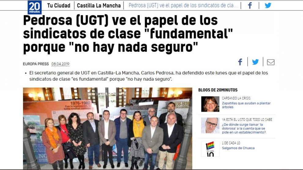 10 de abril. 20 Minutos En la inauguración de la exposición sobre los 130 años de historia de la UGT, en la Diputación provincial de Albacete, que Pedrosa ha calificado como “la casa de todos los pueblos”, ha puesto como ejemplo de este riesgo que “lo que hemos...